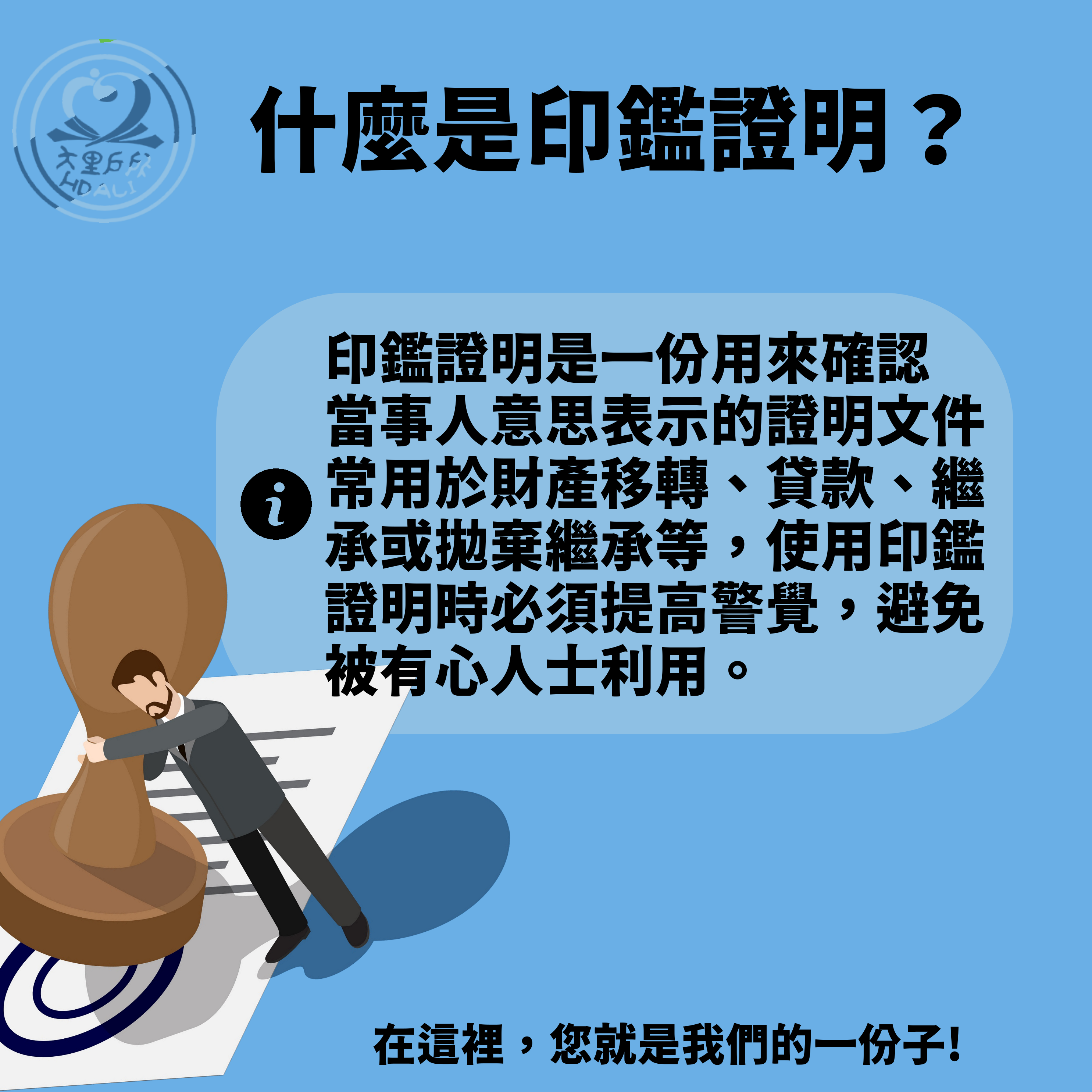 印鑑證明 印鑑證明是一份用來確認當事人意思表示的證明文件,常用於財產移轉、貸款、繼承或拋棄繼承等,使用印鑑證明時必須提高警覺,避免被有心人士利用。 臺中市大里區戶政事務所 關心您 詳情請洽04-24063251