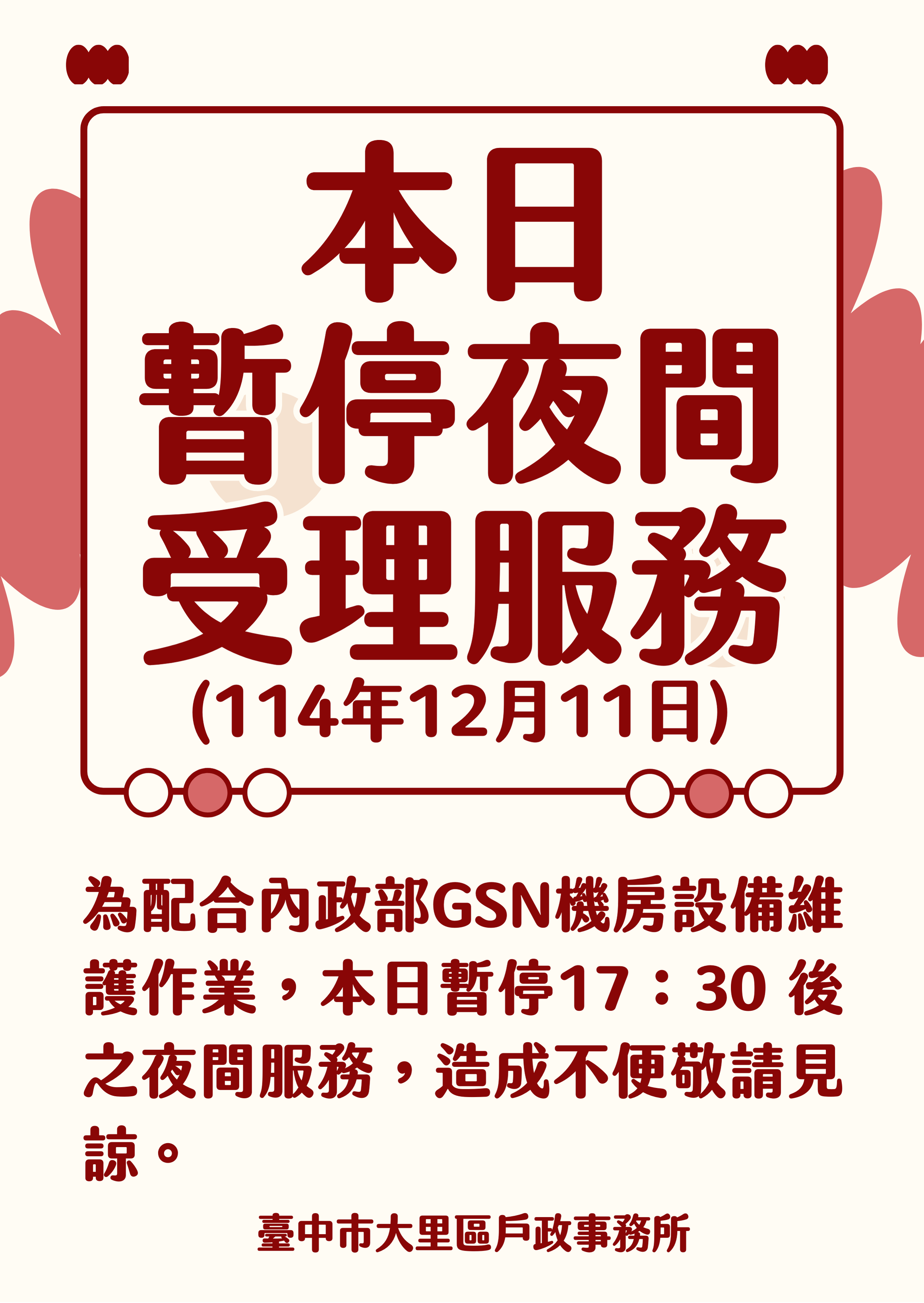 為配合內政部GSN機房設備維護作業,本日(114年12月11日)暫停17:30 後之夜間服務,造成不便敬請見諒。