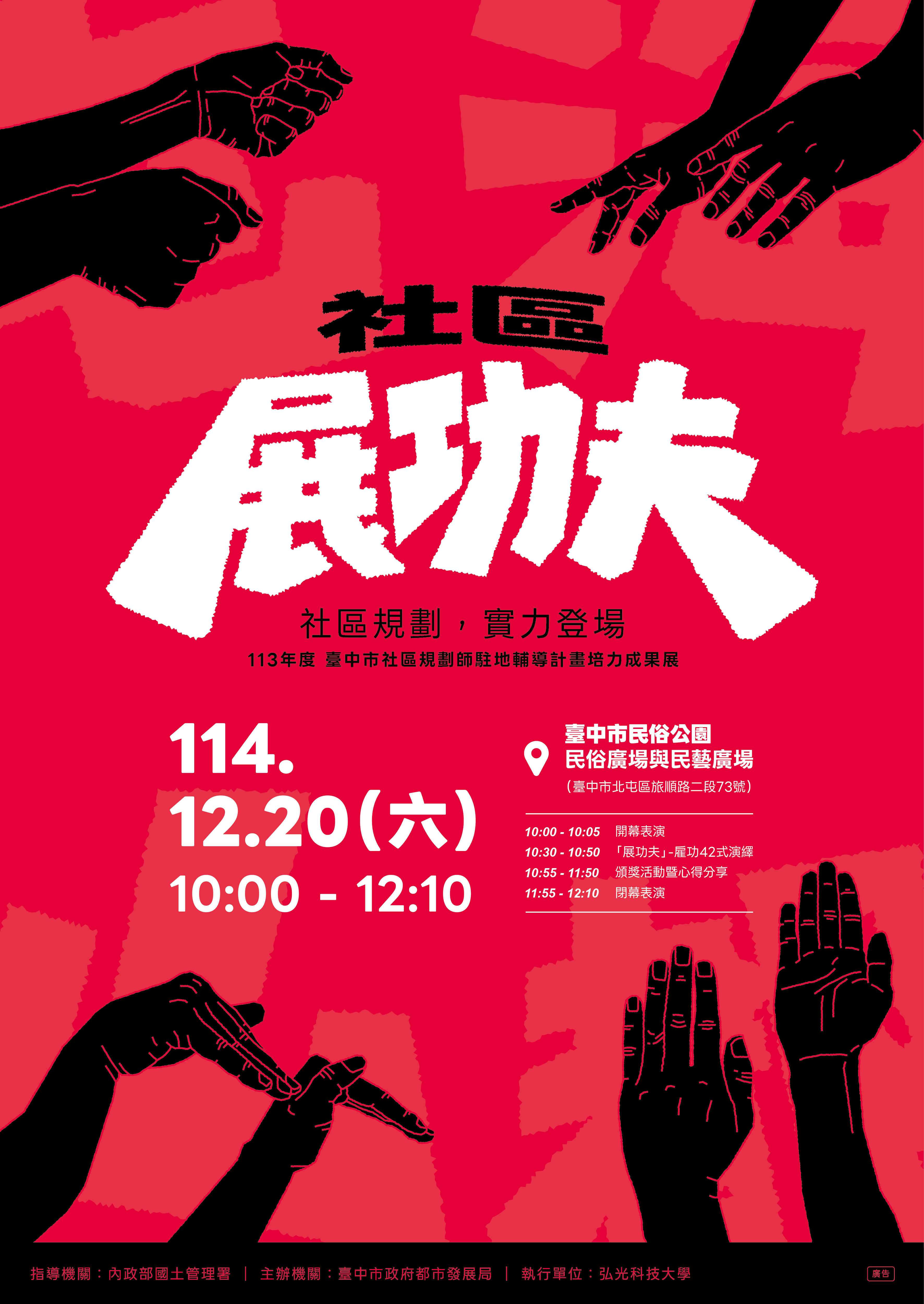 臺中市政府都發局辦理「113年度臺中市社區規劃師駐地輔導計畫成果展覽暨推廣案-社區展功夫」活動。(詳如海報)