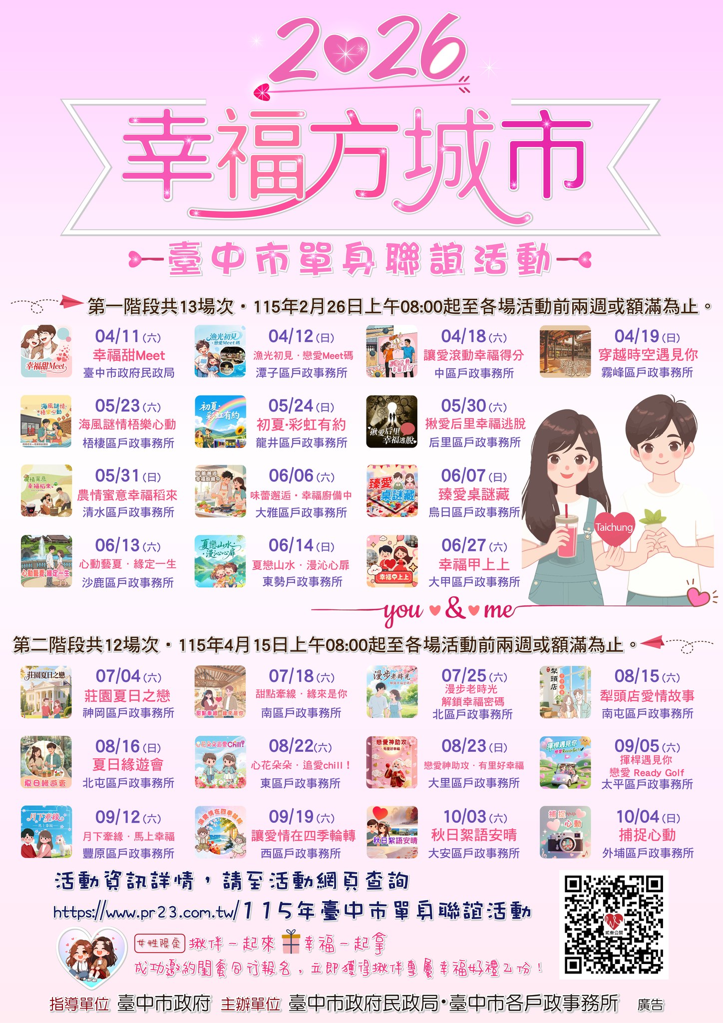 二、 活動報名期間自2月26日上午8時起額滿為止,採線上報名方式,各場次參加人數除首場民政局主辦「幸福甜Meet」為50人(男女各25人),其餘戶所主辦場次皆為40人(男女各20人),每人酌收報名費500元,此外,只要女性揪伴一起報名成功,即可獲贈精美小禮。各場次年齡限制及舉辦日期等資訊請至活動報名網站( 115年臺中市單身聯誼活動 )或掃描海報QR Code查詢。