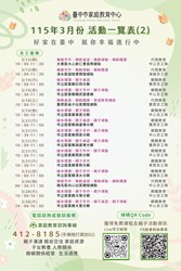 臺中市家庭教育中心115年3月份活動一覽表1 臺中市家庭教育中心【115年3月份活動一覽表】春日幸福登場。 春風吹拂,幸福發芽! 以陪伴大家增進自我成長,促進家庭和諧,提升親子、伴侶親密關係為目標,精心規劃貼近生活議題的多元課程活動,誠摯邀請您一起參與❣