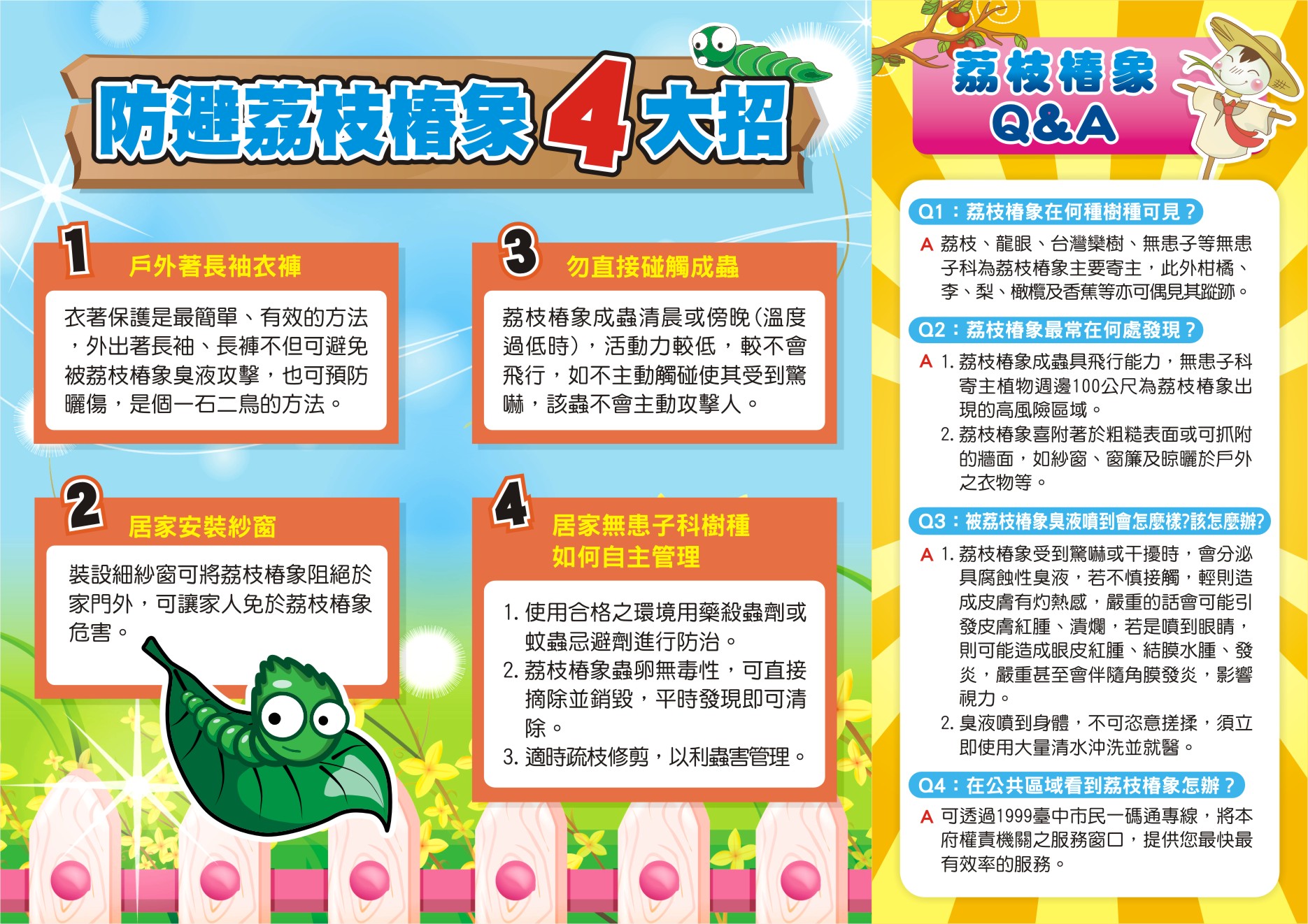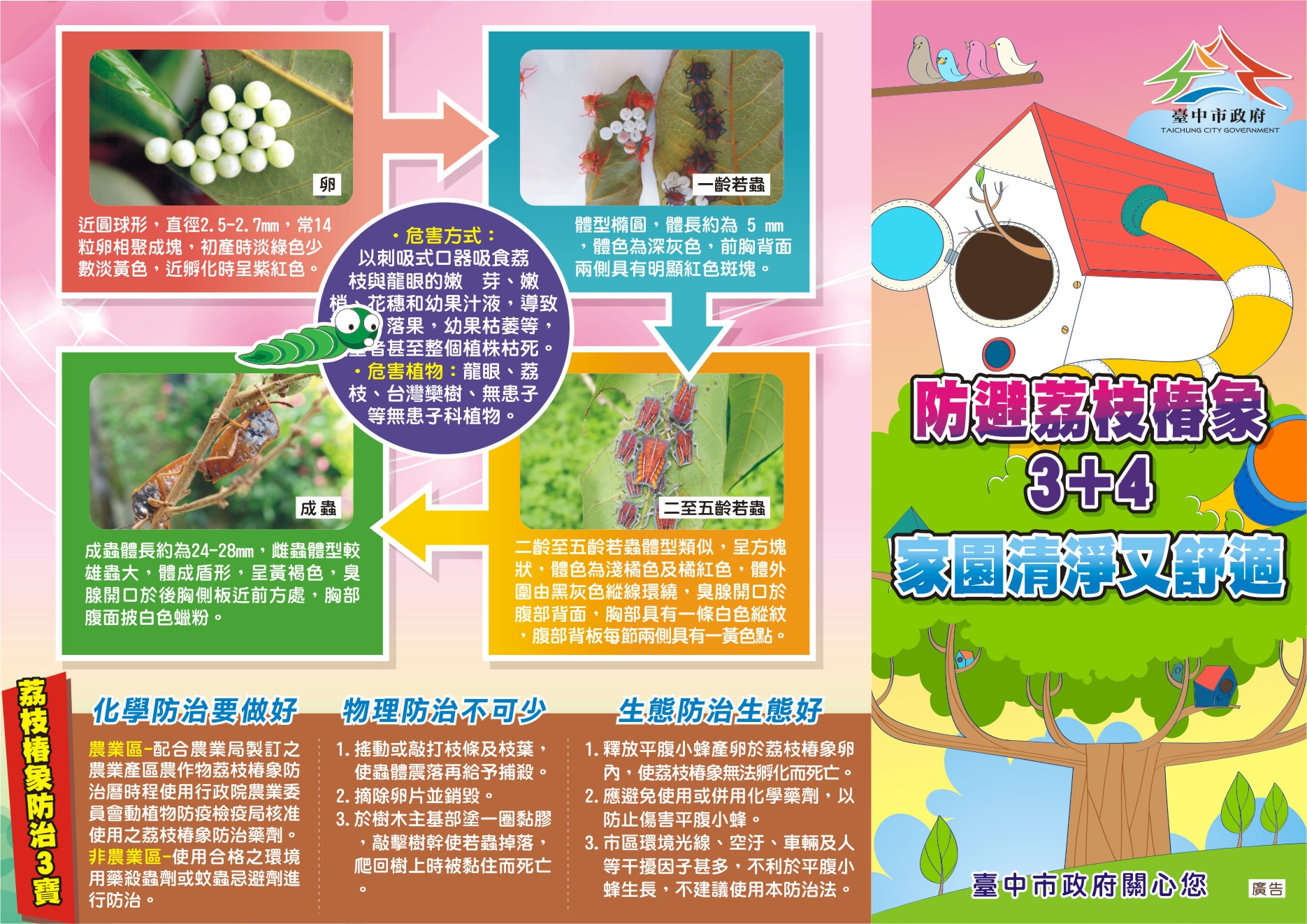 一、動植物防疫檢疫署經現地會勘及專家學者建議,依據目前氣候狀況、荔枝及龍眼作物品種與生長期差異及荔枝椿象雌蟲發育狀況,將全國荔枝及龍眼產區分為高屏、嘉南、中彰投雲及苗栗等4區,分別訂定最適宜的防治期,整合農民進行區域化學共同防治: