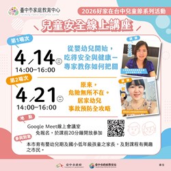 臺中市家庭教育中心舉辦「2026好家在台中兒童節系列活動」暨「115年度第二季親職教育課程」海報 計畫係以提升家長親職知能,協助家長瞭解不同年段的孩子在各成長階段的發展與需求、培養正向的教養態度,並透過活動或體驗方式增進家人互動關係,藉以培養經營家庭所需能力。